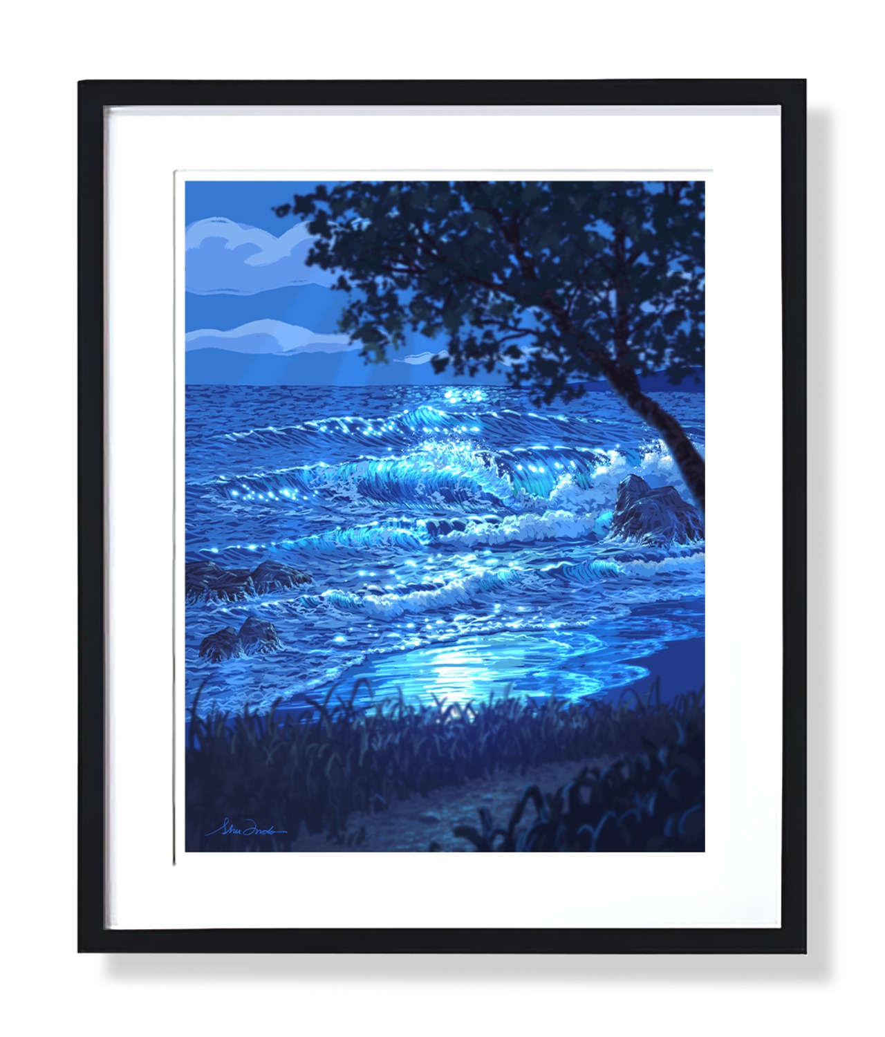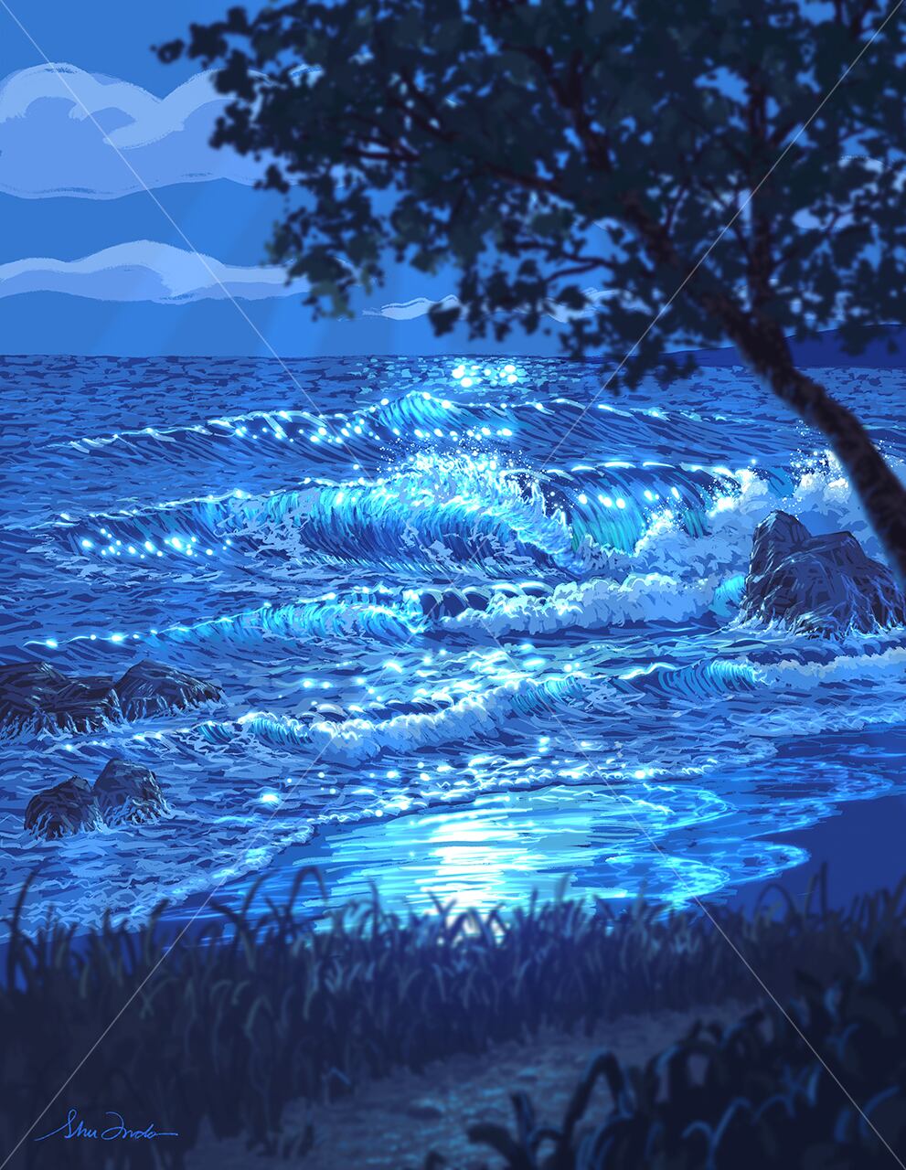 月光にきらめく海を眺められる秘密の小道を描きました。